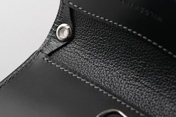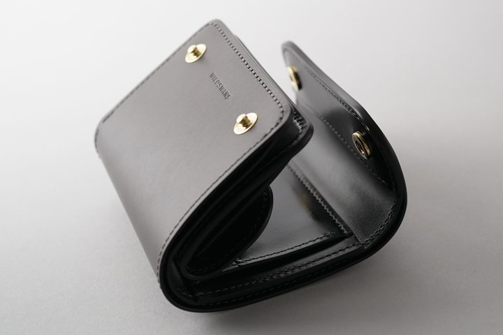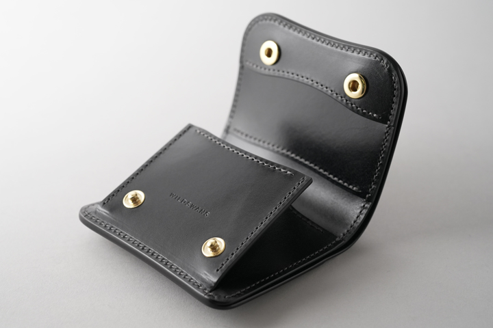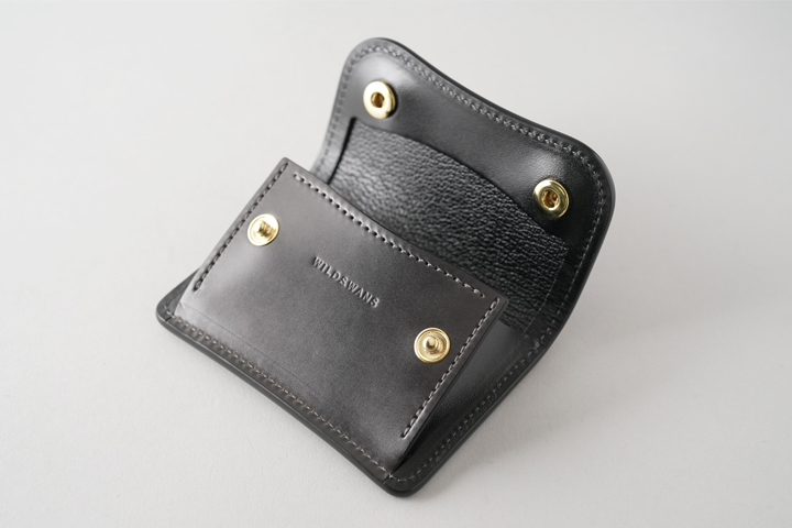 本体のフラップは1点のホックによって開閉を致します。 ホック付きのモデルはWILDSWANSの名刺入れには珍しく、新品時からしっかりとフラップを閉じることが出来ます。