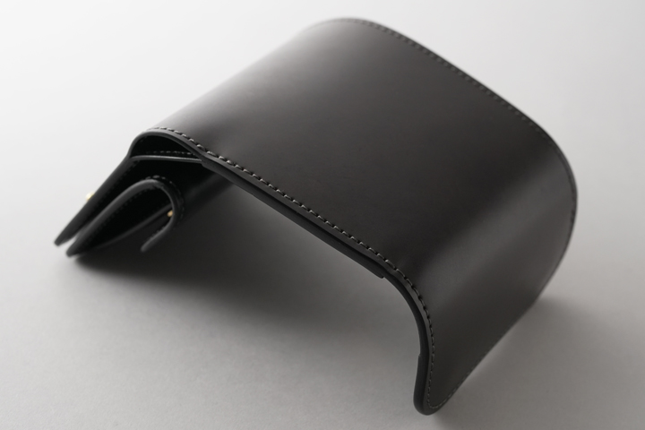 立体的に組み合わせられた収納部を、堅牢な革で巻き込んだアイテムです。