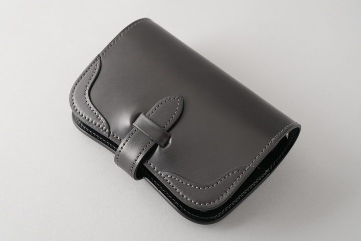 角の補強パーツや本体を閉じるベルトなど、どこか馬具を思わせるような雰囲気に加え、鈍い光沢を放つグレイのコードバンは金属のようでいつも以上の重厚感を感じます。
