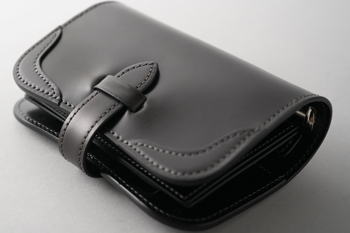 優雅な曲線のデザインが特徴的な、肉厚で堅牢な中型財布です。