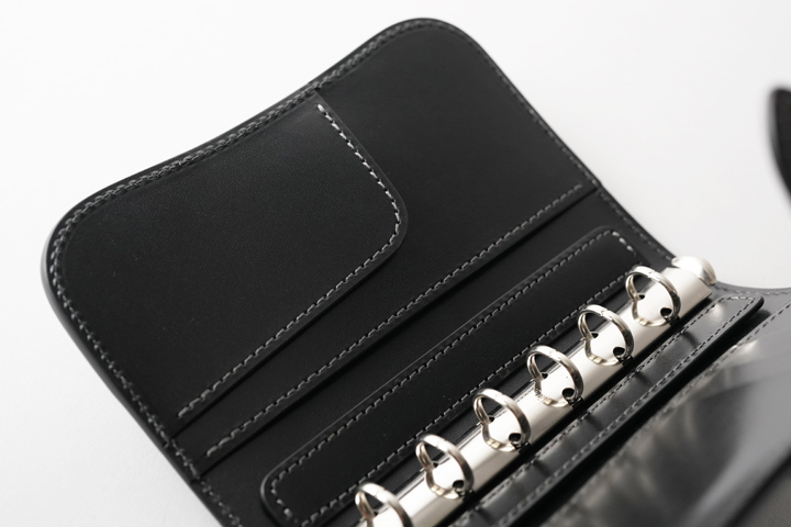 一枚革で包み込むような形状のキーケースで、側面にはハトメが取り付けられています。