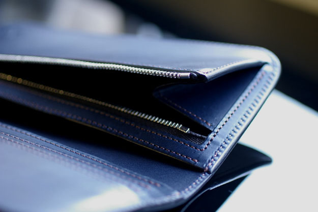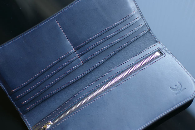 ここに至るまで色々と試行錯誤を繰り返しましたが、結果としてスーツの内ポケットに納まり、且つWILDSWANSらしさも感じられるロングウォレットになったと思います。スペック(最近覚えた単語)としては、札入れ室が2室・カード段が6段・コイン室が1室です。札入れ室は2つともマチ無しです。革の厚みは出しつつ、なるべくスマートになるように、機能はとてもシンプルにしています。コイン室は片マチ構造ですが、これが結構容量があります。