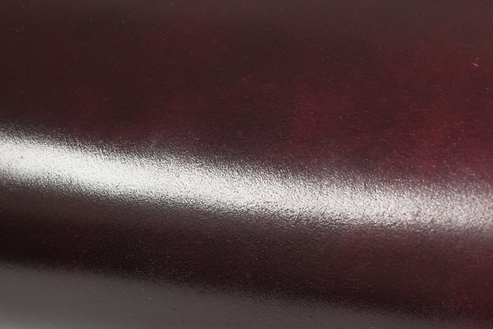 上の画像ではスタッフが約2年使用したシェルコードバン/BLACKのENOを掲載しています。強く鋭い光沢が印象的です。油分を潤沢に含んだ皮革ですので、お手入れは乾拭きや柔らかい毛足のブラシでブラッシングする程度で充分です。