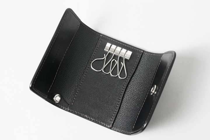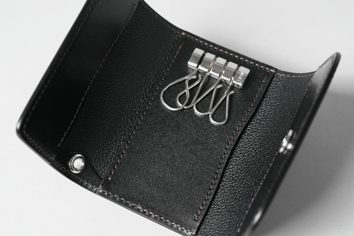 こちらが内装です。中央上部の4連のキーフックはamiet社製のもので、廃番となったCLIPPER2に使用していたものと同様の金具であり、非常に優れた耐久性を持つパーツです。