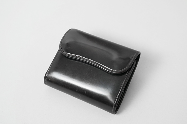 こちらはスタッフが約1年使用したサドルプルアップ/BLACKのENOです。使い始めのギラリとした光沢がさらに艶めきを増し、シェルコードバンに勝るとも劣らない力強い光沢を放っています。