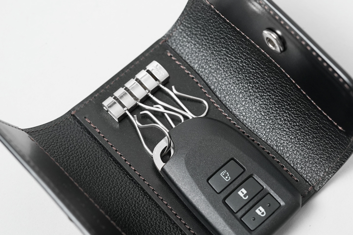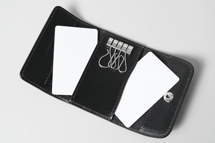 収納する鍵の数や大きさ、カードの枚数によって容量は前後します。スマートキーなどはカラビナキーリングなどの金具パーツなどを介してハトメに装着したままぶら下げることもできますので、フラップが閉じない場合は無理に閉じようとせず、収納方法を変えてお使いください。