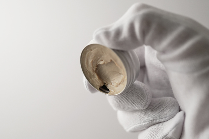 クリームご使用の際の注意点として、このように塗り広げる際にムラによってクリームが溜まってしまうと、乾いた際に塊が残ってしまいます。 濃度が高い分、クリームの塊が残ってしまうと除去しにくくなりますのでご注意ください。