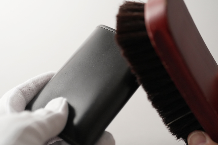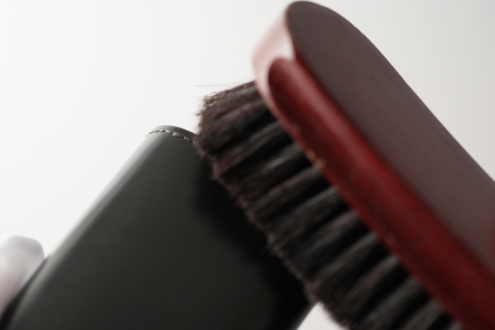 初めに皮革表面を乾拭き、またはブラッシング致します。 これは艶を出すためでは無く、クリーム塗布の際に汚れや埃を塗り込めてしまわないようにするためです。
