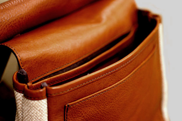 色違いの糸を織り込んだ先染めツイードを、マチ部分にのみ使用しています。これもまた贅沢な使い方なのですが、この鞄の重要なアクセントになっています。
