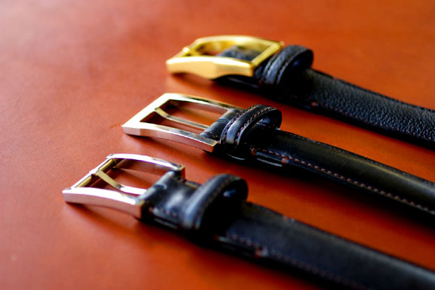 バックルの形状は今のところ3種類ご用意しています。どちらかと言えばドレス向きなので、今後カジュアルなものも増やしていけたらいいなと思っています。バックルの色は金色、もしくは銀色をお選びいただきます。どちらも材質は真鍮で、心地良い重量感があります。