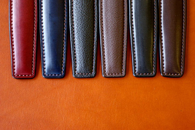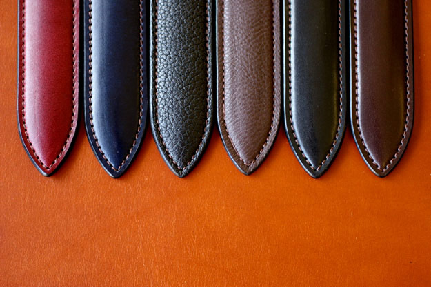 その他、お選びいただける革についてですが、革小物のパターンオーダーにも使われているベルギー産のサドルプルアップの他に、イタリア産のブッテーロ、ドイツ産のシュリンク・カーフ、フランス産のチェルケス・・・、とタンニン鞣しの革もあればクローム鞣しの革もあります。それぞれに良さ、特性がありますのでお客様のお好みに合わせてお作りいたします。