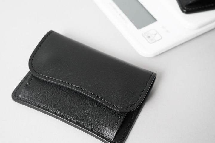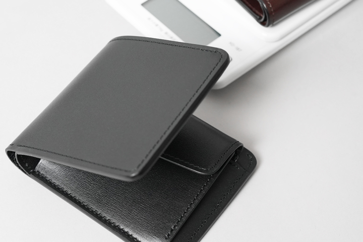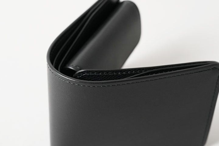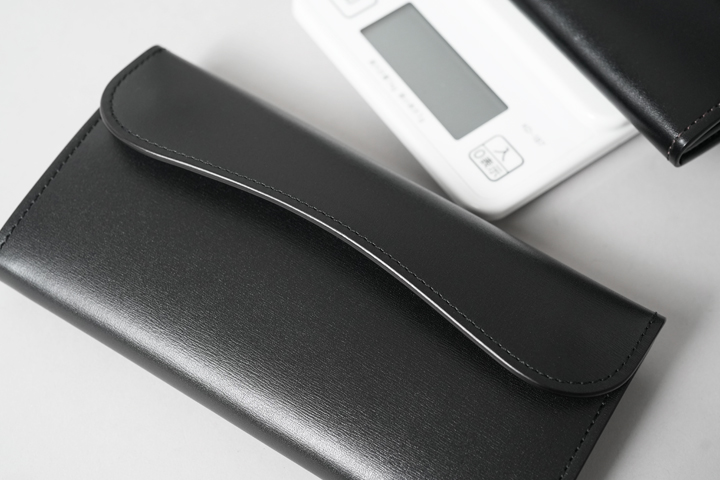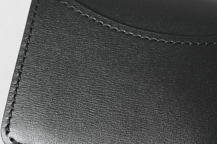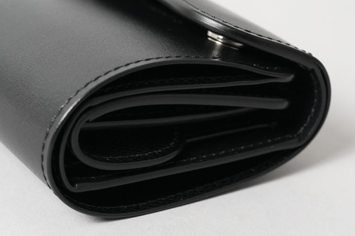 さて、今回はこのテキサスグレインを用いて特別なシリーズを展開します。カラーはNOIR(ノアール)。水シボが映えるブラックカラーに、シルバーのホックと刻印が涼やかな組み合わせです。そして当シリーズの最大の特徴は、薄く軽量なテキサスグレインの強みを引き出す「製品のつくり」にあります。