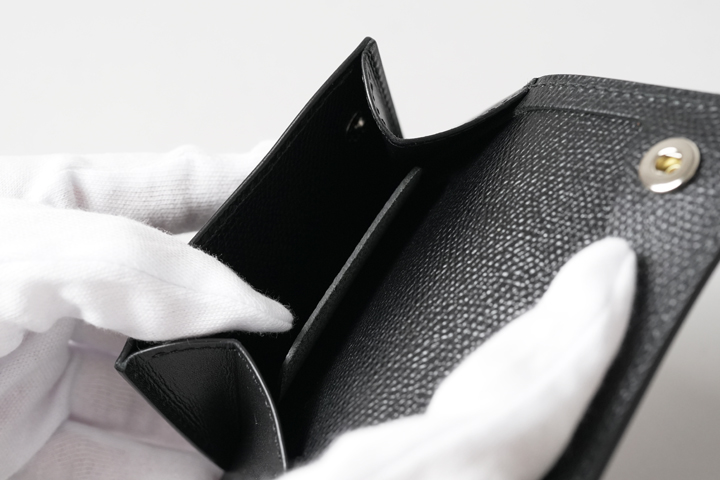 コインケース内をご覧ください。従来はコインケースの内装は床面(皮革の裏側)に囲まれた仕様でしたが、今回は四方の床面全てが覆われ、ラグジュアリーな雰囲気に仕上がっています。コインケースの裏側には、さりげなく収納スペースが設けられています。