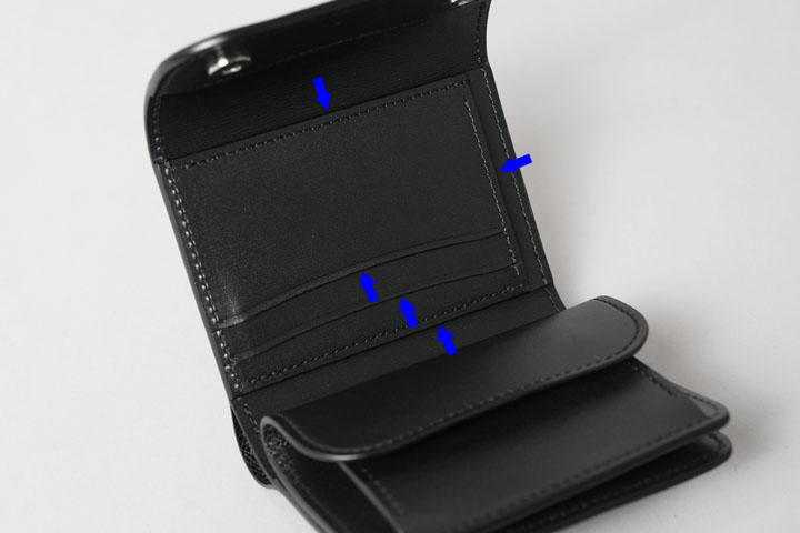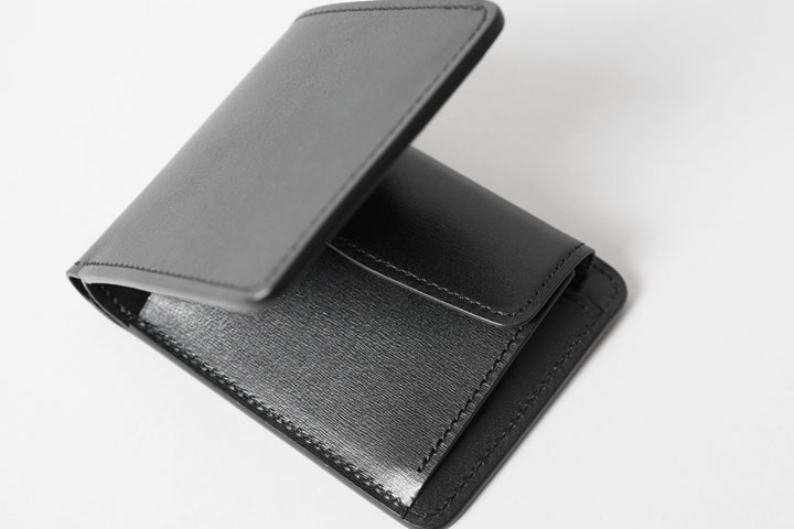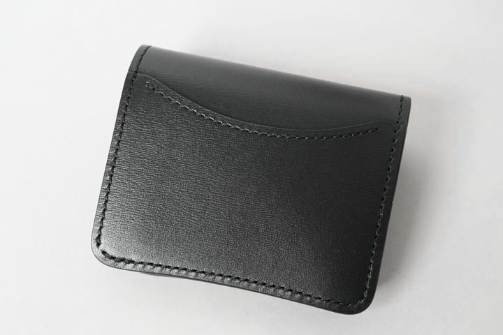コインケース付きの二つ折り財布です。片側にはあおりポケット状に縫製されたカード収納部が備わっています。もちろん、こちらもWINGSと同様に一段ずつ裏貼りが施されています。