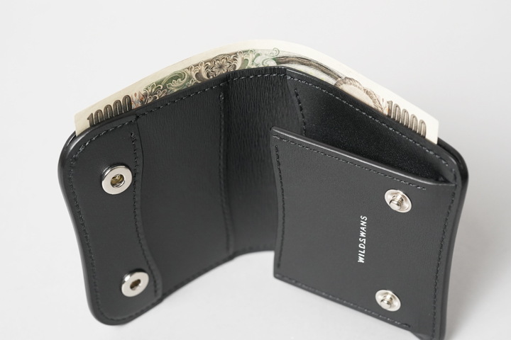 本体を広げると、さながら優美な翼(WINGS)のようなシルエットです。札室パーツの中央を窪ませることで指を掛けやすく、中身が取り出しやすいデザインに設計されています。