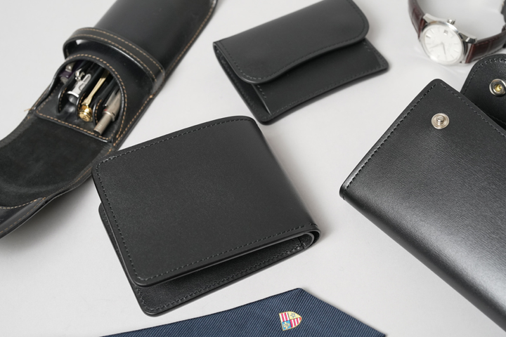 さらに、製品を形成する数多のパーツのほぼ全てに裏貼りを施しています。裏貼りをすることで軽量化と同時に耐久性も高まり、なおかつ床面(皮革の裏側)が隠れるため、薄型のつくりもあってドレッシーな装いに仕上がっています。2枚の皮革を貼り合わせる裏貼りには、縫製とコバを磨く作業が伴います。そのためパーツの一つ一つを丁寧に縫製し、丹念にコバを磨き上げた今回は、いつも以上に惜しみなく手がかけられた職人の魂が宿る特別仕様です。ここからはそんなスペシャルなアイテムについてご紹介して参ります。登場するのは下記の6アイテムです。