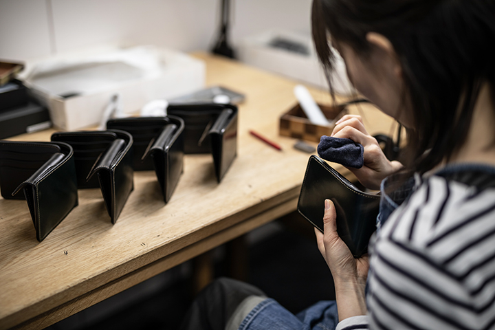 多くのWILDSWANS製品は、茨城県の自社アトリエで職人たちが一つ一つ丁寧に製作をしています。一部に機械による工程もありますが、多くの工程が手作業によるものです。このため一つの製品が出来上がるまで、長い時間を要します。手作業は一見すると非効率なものと捉えられるかもしれませんが、WILDSWANS製品の製作において、機械では困難な工程があることに加え、非常に細かな技術が要求される部分も多くあることから、現在においても手作業の工程を重視してものづくりを行っています。
