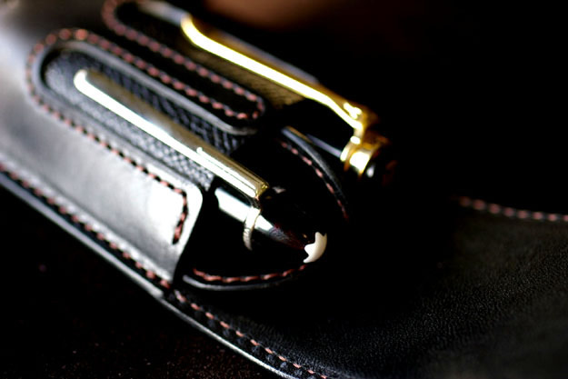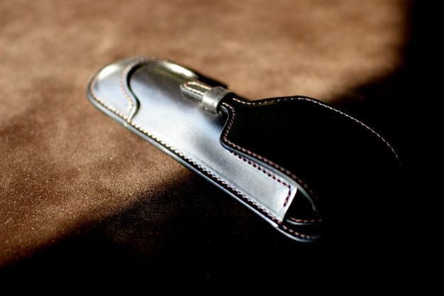 PEEK-A-BOO(2)の続きです。ペンケースの先端部分には角当てを付けて補強しています。MONT-BLANCやそれ以外のペンを装着したときでも、先端の当たりを防止する役目を果たします。