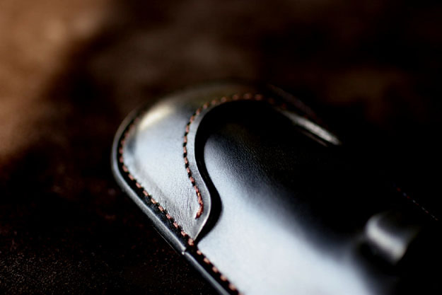 型押しのフレンチカーフ部分の厚みは極限まで薄くしたいところですが、摩擦に対する強度との兼ね合いからある程度の厚みが必要になります。と言ってもなるべく薄くは作っていますので、お店に置いてある見本でお確かめ下さい。