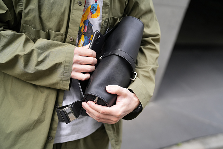RIGIDについてさらに細部をご案内します。ショルダーストラップは、当然ながら長さの調整が可能です。さらに付属の金具を用いてウエストポーチとして使用することも可能です。ウエストポーチ仕様の設定は以前ご紹介したNEWSをご覧ください。