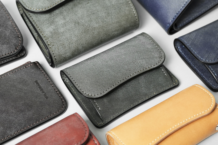 GREEN(グリーン)。「type2」シリーズで同名のカラーが登場しましたが、こちらも以前とは似て非なるカラーです。柔らかな印象を抱きやすいグリーンですが、オークバークで鞣した今回はかなりグレイッシュなグリーンに仕上がり、背筋が伸びるような凛とした表情です。隙のない雰囲気を壊さないよう、ステッチはチャコールグレーを使用しています。