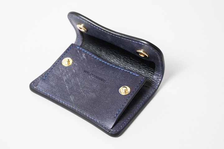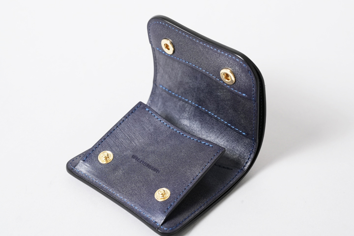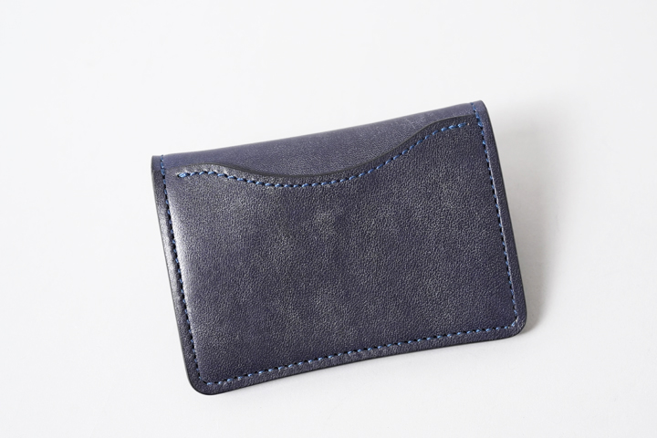NAVY(ネイビー)。以前、「type2」と称して一般的なタンニンで鞣した同皮革のネイビーを発売しましたが、今回のネイビーはオークバーク鞣しで製造されているため、type2よりも深く落ち着いた発色で仕上がっています。普段はブラウン系のカラーが多く展開される中で、夜空のような濃紺が新鮮です。ステッチには同色のネイビーを使用しています。