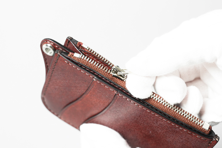 中心部はファスナー式のコインケースになっています。ファスナーはYKK社のエクセラですので、小さくも滑らかな引き心地です。