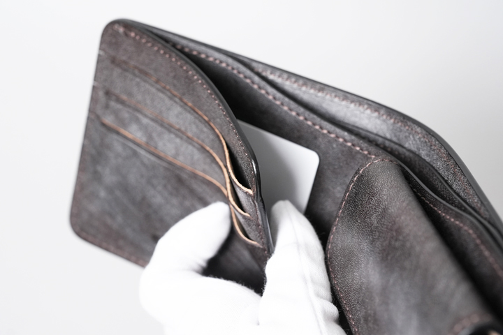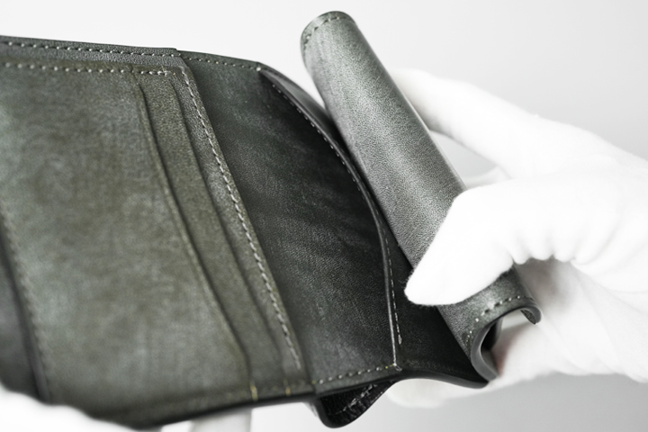 ※コインケース上部のスペースにカードなどを収納した場合、入り口付近の革や縫製が切れる可能性があるため、こちらには何も収納しないようお願いします。