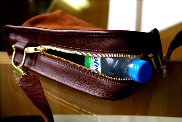 鞄の開閉はL字形にファスナーを引いて物の出し入れをします。ファスナーはエクセラファスナーの8番を使用しています。小さい鞄に、迫力のある大きなファスナーが映えます。