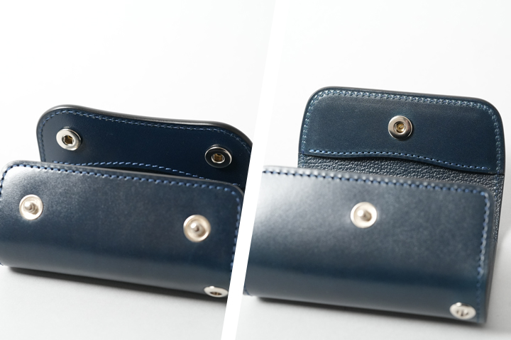 フラップは他の財布類と同じく2点のホックで留められています。