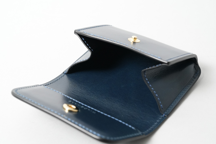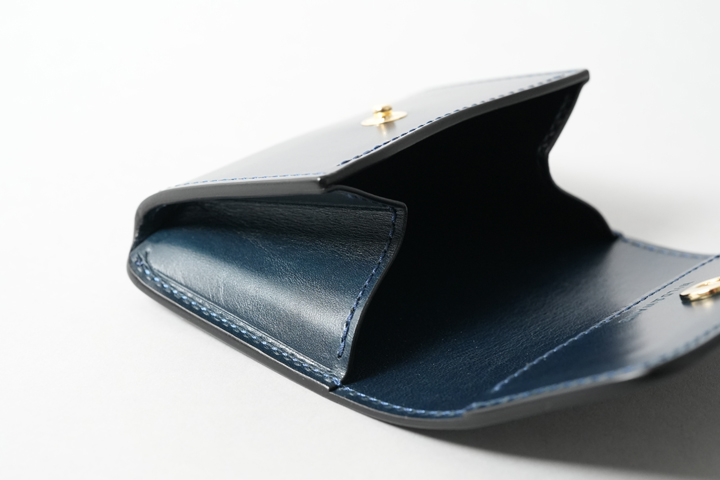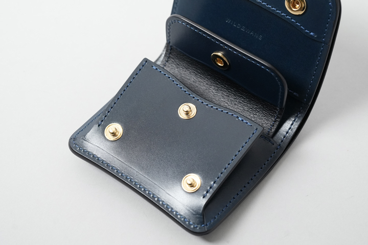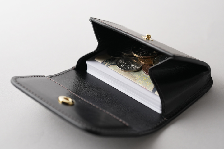 コインケースのフラップには1点のホックが付きます。コインケースは深さのあるサイズ感のため、ある程度の収納力を備えています。