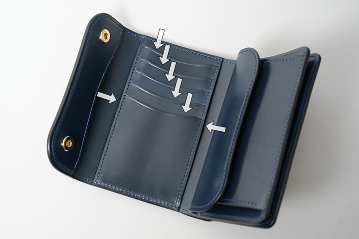 内装には、右側にコインケース、中央にカードポケットが並び、それぞれのカードポケットは矢印で示しています。