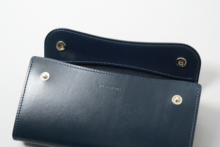 フラップに備えられたホックを1点ずつ開きます。WAVEのフラップにも2点のホックが備え付けられていますが、1点ずつ開いていただくとホックの寿命が延びますので是非お試しください。