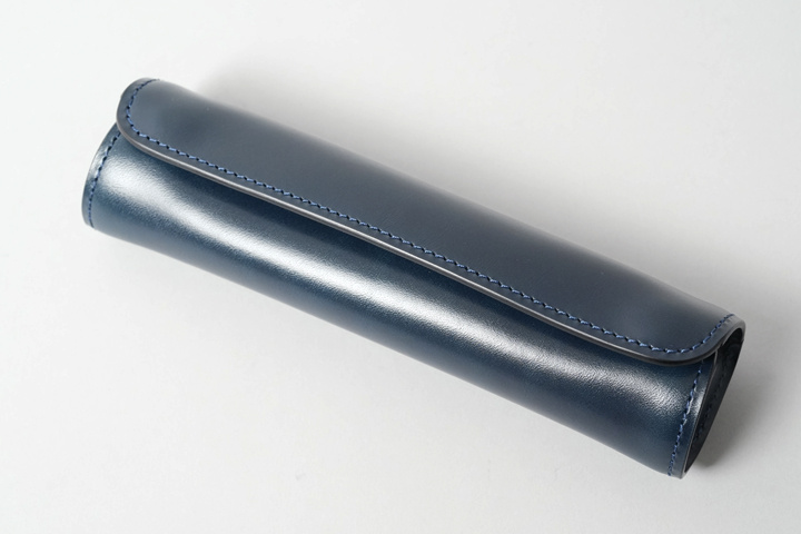 革を筒状に丸めてペンを収納するタイプのケースで、外装には切れ目の無い一枚革を使用しています。