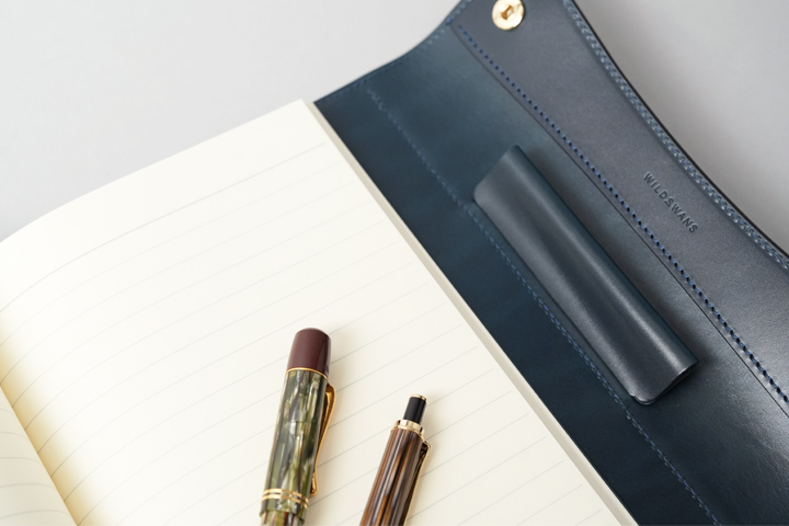 フラップは左右2点のホックで留められており、内部にはペンホルダーが付属しています。 このペンホルダーにはスーベレーンM800などの太さ(直径14mm前後)のペンが収納できます。