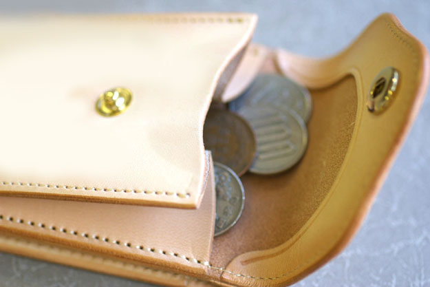 PASSAGEについての続きです。マチの付いたコインケース部分にコインを入れてみたところです。あるお客さんは、この部分にコインを入れずにサプリメントを入れて携帯していましたし、また別の方は自宅の鍵を入れられていました。(←確かに鍵と定期をセットにすると、通勤時に1つで済むので便利かも、と思いました。)