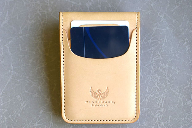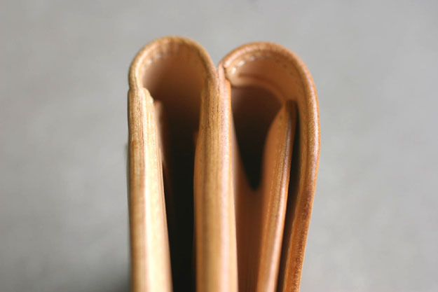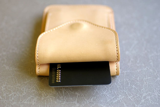 外側の背面にカードを2枚挿入したところです。カードを差し込む部分には緩やかなカーブのついた革の仕切りがありますので、1枚1枚が取り出し易くなっています。(但し、革が馴染むまでの最初の頃はキツイです。)