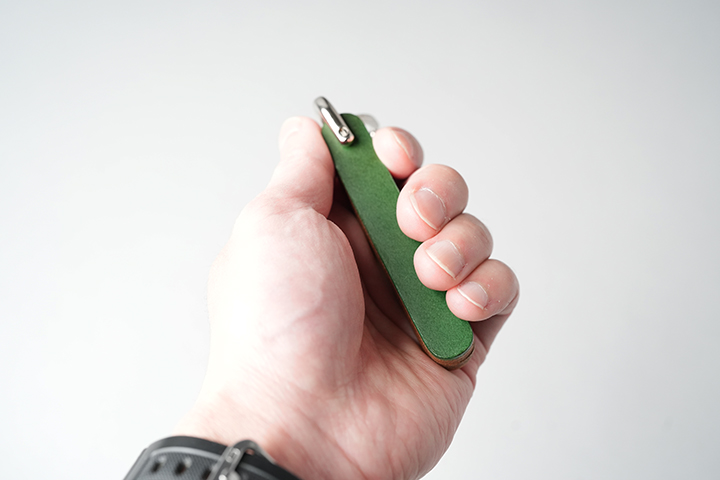 続いては、幾重にも革を重ねた肉厚なキーホルダーです。程よいボリューム感により手にも馴染みやすく、毎日お使い頂けるアイテムです。