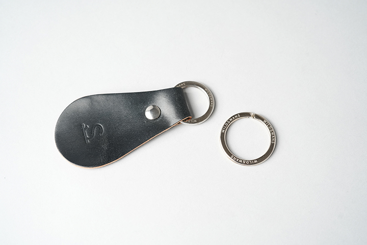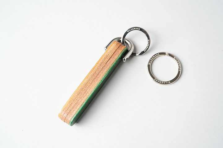 表裏の革の間にトコ革(革の裏面)を重ねて製作するためコバ部分がざらついた状態になります。そのためボディが滑らかな質感になるまで、ひたすらやすりがけをして頂きます。一つ一つは簡単な作業ですが、比較的工程が多く、完成までに少し時間がかかるアイテムです。ぜひ本格的なクラフト体験をお楽しみください。なお、キーホルダーにはWILDSWANSオリジナルの二重リングが付きます。上の画像でサンプルに付属しているリングは以前から使用している二重リングで、その隣にある単体のリングがWILDSWANSの新しい二重リングです。実はこの新しい二重リング、今回が初めてのお披露目となります。これまでの二重リングよりも少しサイズUPすることで、より使いやすさを追及したパーツとなりました。