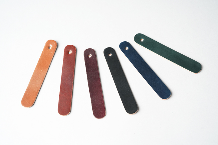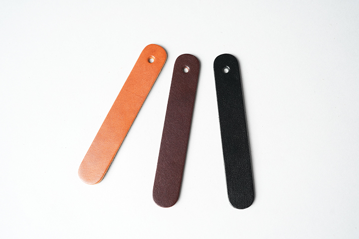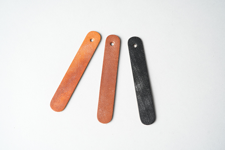 シューホーン(靴ベラ)は紳士淑女のアイテムです。何かと重宝するこちらのアイテムを手軽にご自身で製作できる機会はそうそうありません。背面は、カシメ(金具)が付いた表革の折り返し部分を除くと革のトコ面(裏面)が大部分を占める仕様です。