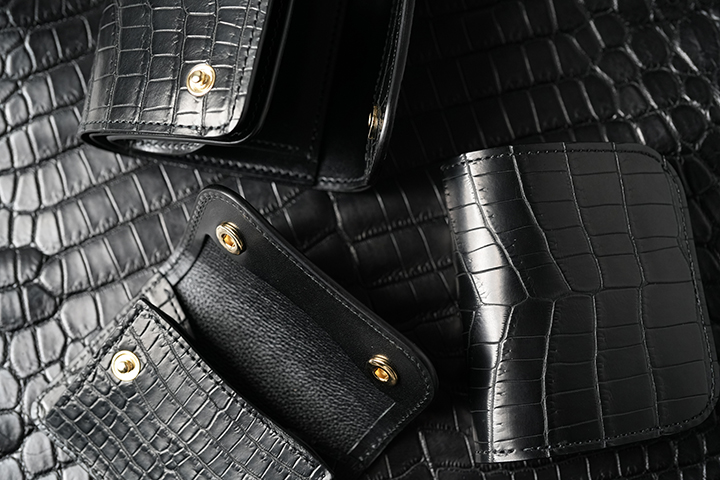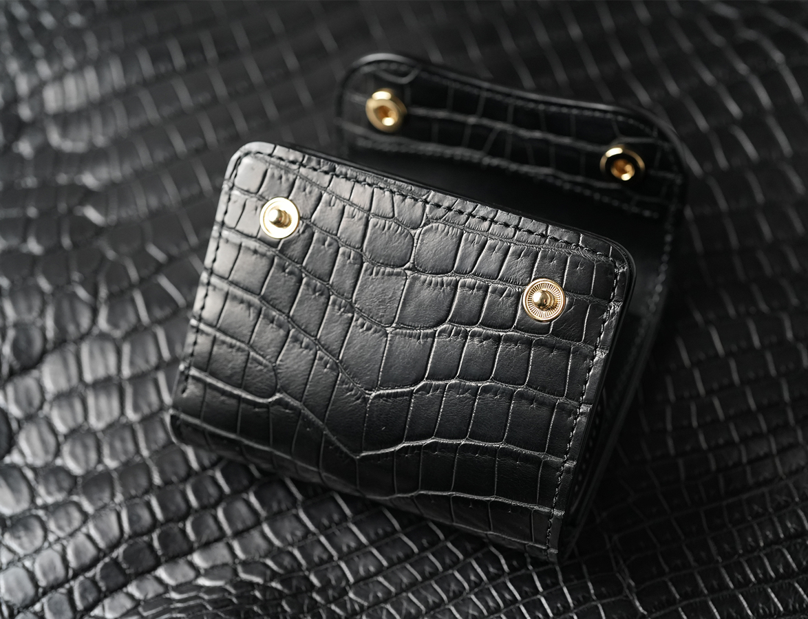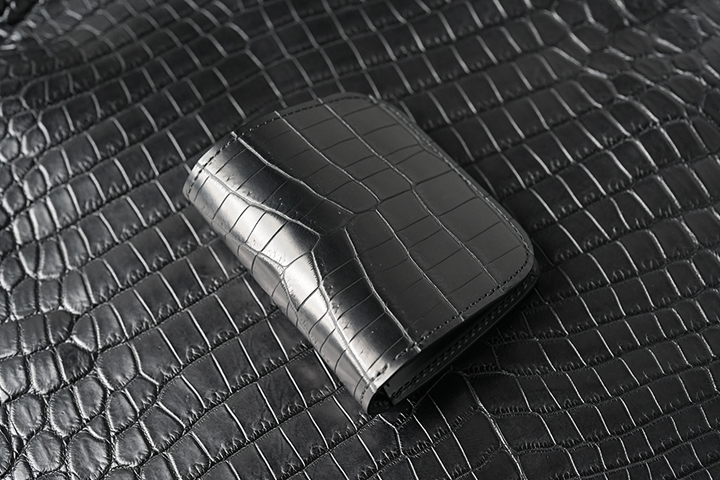 上の画像は以前販売したクロコPALM-V3ですが、こちらはセンター取りではない通常の裁断を行った個体です。先ほどもご案内したように、WILDSWANSでは中型、小型のアイテムにおいてはセンター取りを採用していません。その理由は、WILDSWANSの基本的な裁断方式が一枚の革から無駄なく裁断することが理由となり、当然価格においてもこの裁断方式が影響しています。一方でお客様からは中型、小型アイテムにおいてもセンター取りを希望されるケースも少なくありません。そこで、今回の受注会ではこのようなお客様のご要望からWILDSWANSを代表する小型、中型アイテムにおいて、センター取りのクロコダイルを外装(および一部内装パーツ)に用いたアイテムの受注会を期間限定で開催します。早速、ラインアップと受注会の概要をご紹介しましょう。