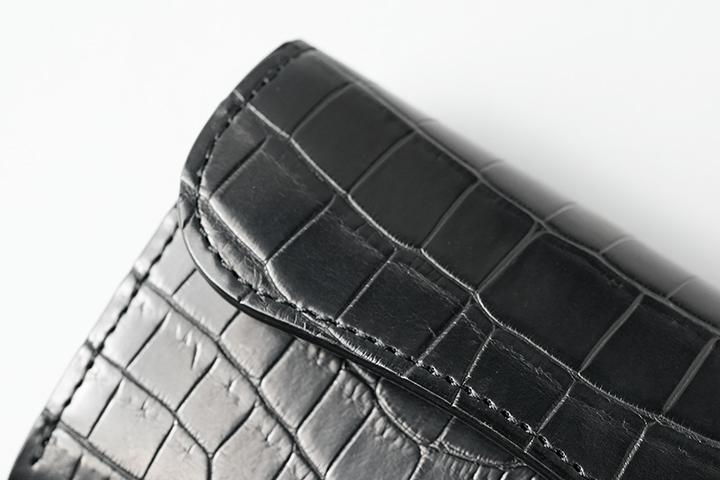 そして、両マチにもクロコダイルです。小さなパーツのためこちらについてはセンター取りパーツではありませんが、全方位からクロコダイルが堪能できる仕様です。また、マチ裏には裏貼りが施されています。