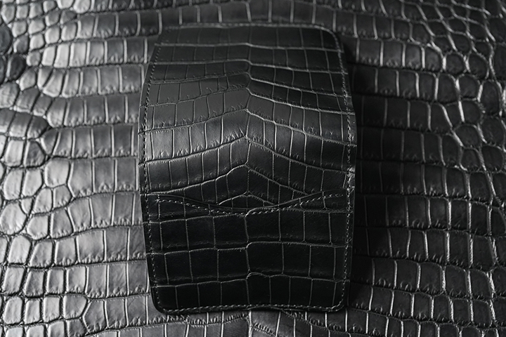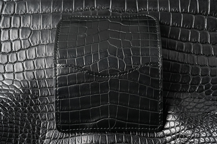 シリーズ最後に登場するのはENOです。TONGUEやCASAのように背面ポケットがない分だけ、一枚革かつセンター取りのクロコダイルのインパクトはとても印象的です。
