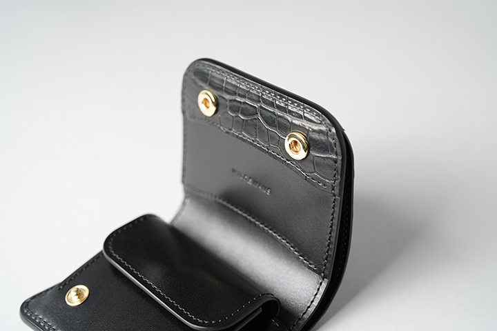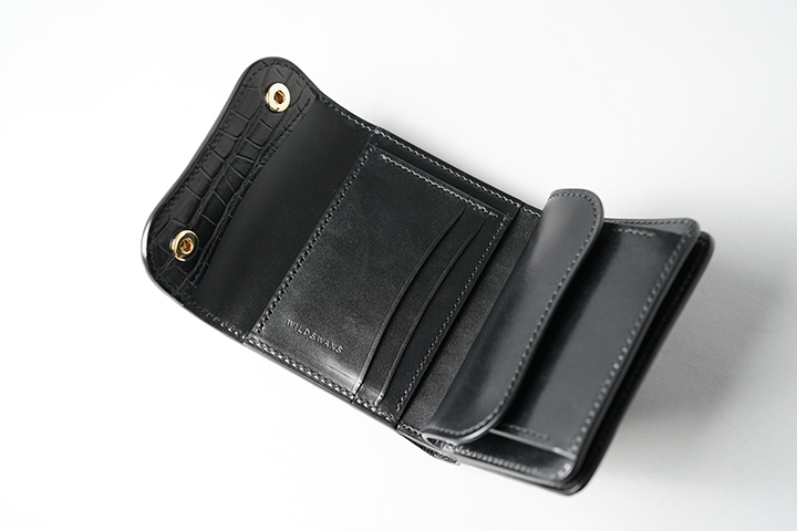 そして、フラップを開くとフラップ裏の先端もまたセンター取りのクロコダイルとなっています。小さなパーツですが、外装のイメージの余韻を内装においても続けて堪能することができます。 その他の内装部分はサドルプルアップのブラックをメインに、コインケースのマチ裏や札室内など規定の箇所に型押しの牛革/ブラックを組み合わせています。WILDSWANSのロゴはフラップの背面に刻印しています。