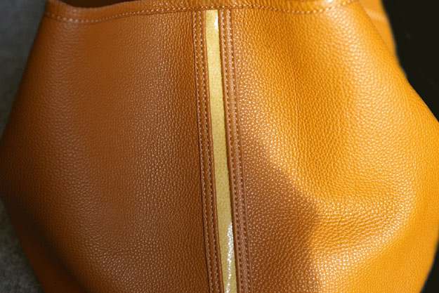 そしてこの鞄のワンポイントとして使用しているのが、両サイドのマチ部分にキラリと光るガルーシャ(エイ革)です。ガルーシャのラインが快活で爽やかなイメージを与えるので、野暮ったくならずに全体の印象を引き締め、洗練された佇まいにしてくれます。このアクセントが、これ見よがしでは無い、さり気ない大人のお洒落として効いています。