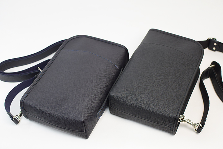 また、SOLONの外装には外付けのポケットを備えています。さらに、ショルダーストラップを外して、上の画像のように本体片側のハンドストラップに手を通せば、クラッチバッグとしてもお使い頂けます。これらの点もCOLLIERとの大きな違いです。SOLONは汎用性の高さとシュランケンカーフが醸し出す上品な佇まいから、カジュアルからドレスまで様々なシーンで活躍します。こちらも現在、BLACK、NAVYの2カラーで在庫をご用意しています。