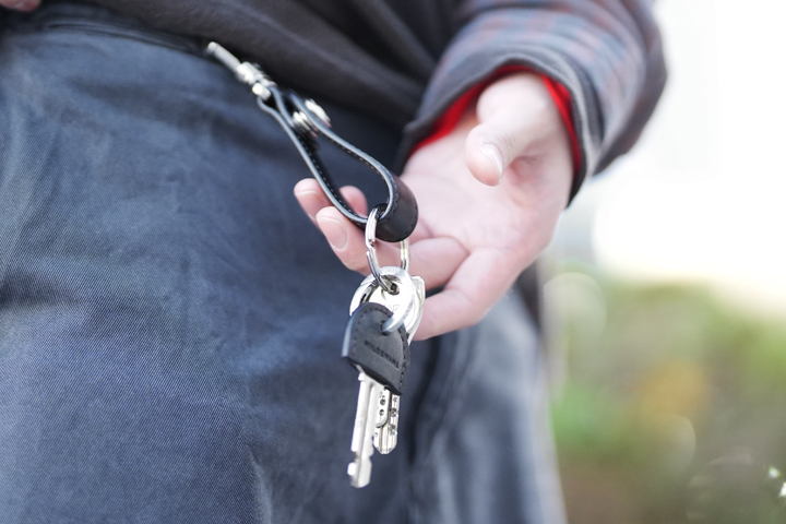 このように二重リングには鍵類を取り付けた状態で、先端のナスカンを介して様々なものに接続します。 鍵や小物を二重リングに直に接続したり、また小さなリングなどを経由して取り付けたりと、鍵のサイズや用途によって組み合わせてご使用頂けます。