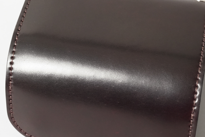 優れた皮革製造技術を持つアメリカ・ホーウィン社が製造するシェルコードバンは、馬の臀部の皮を削り出すことで現れるコードバン層を丹念に鞣して染色した、世界的に人気が高い皮革の一つです。肉厚で弾力がありながら非常に肌理が細かいシェルコードバンは、その繊細な表面からは想像ができない程耐久性に優れた皮革です。使い込むにつれてゆっくりとしたスピードで光沢を帯びていき、重厚感あふれる表情へと変化をしていきます。