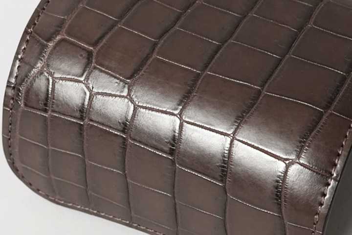 クロコダイルレザーは見た目の美しさ、唯一無二の個性的な模様、優れた耐久性により非常に人気が高いエキゾチックレザーです。手触りはしなやかで硬質な中にも適度な弾力があり、角質で覆われた表面は強度や耐久性にも優れています。軽くて丈夫な上、使い込むほどに光沢が増しますので、より一層の風格と迫力をお楽しみいただけます。