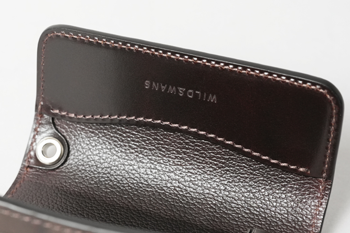内装には、WILDSWANSの定番素材としておなじみのベルギー牛革・サドルプルアップを使用しています。堅牢で硬質なサドルプルアップは耐久性が高く、永くお使い頂いてもハリ感が損なわれにくい皮革です。